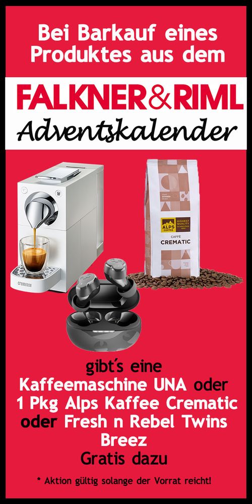 - Gratis Produkte - ab einem Kauf eines Produktes aus dem Adventskalender erhaltet Ihr entweder eine Cremesso UNA Kaffeemaschine oder 1 Pkg. Alps Kaffee oder Fresh n Rebel Twins Breez Kopfhörer.